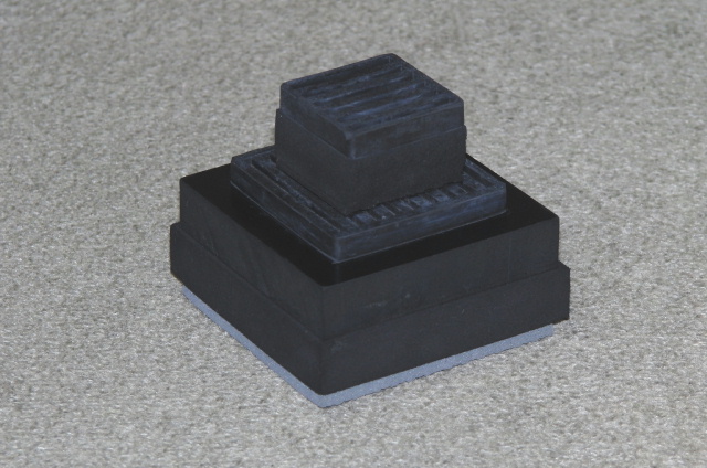 試行錯誤を繰り返して結論に至ったのは、柔らかい部材と堅い部材を交互に重ね、更に横方向の自由度も確保するためにピラミッド型に積み上げたもの...。ということで作ったのが下の写真のショックアブソーバーです。軟質・硬質のウレタンゴムを交互にアロンアルファで接着しています。