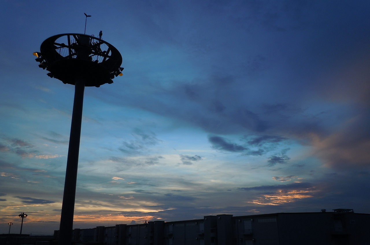日没に間に合うように慌てて車を飛ばしましたが、撮影できたのは残照のコンテナヤードでした。照明灯のてっぺんにある避雷針にカラスが留まろうとしています。
