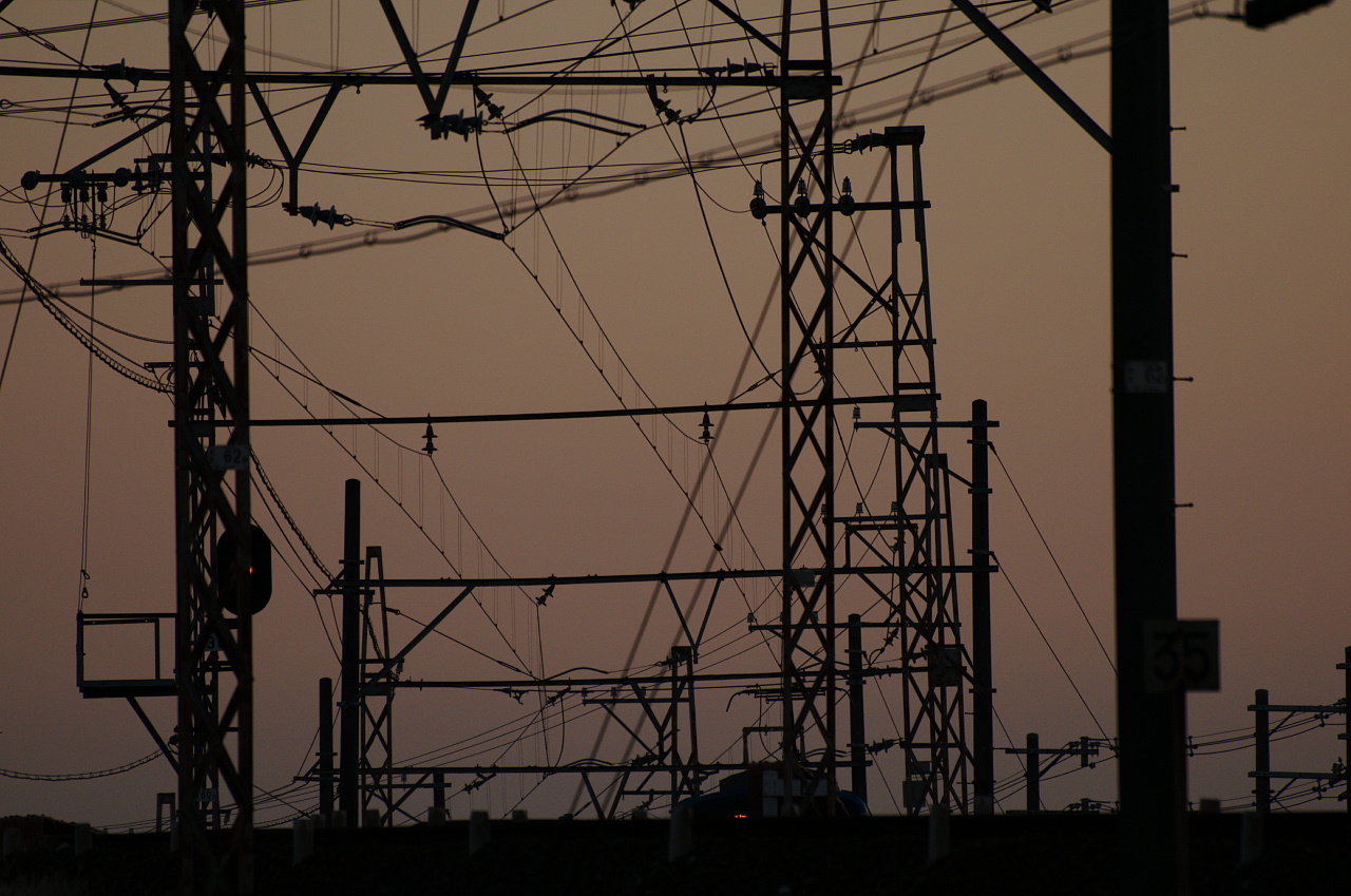 電線と鉄柱の間から最初はパンタグラフが現れ、次に行先表示板、そしてヘッドライト・・・
