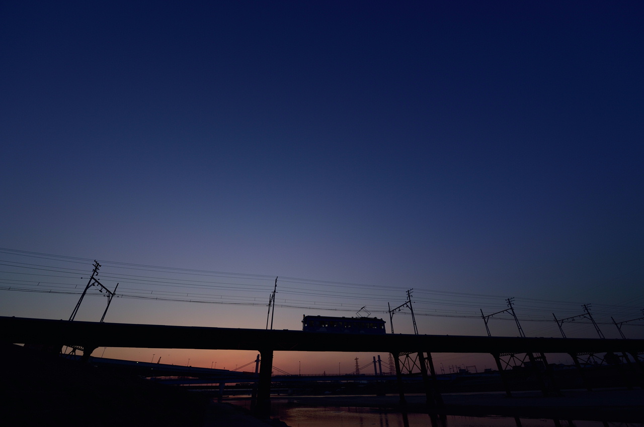 引き続き、撮り慣れた感のあるマジックアワーのモ161形です。もう少し待てばもっと謎めいた色に変化するのでしょうけど、その時間にもう一度浜寺方面行きのモ161形が現れる確率はちょっと低いかなと、この一枚で妥協しました。