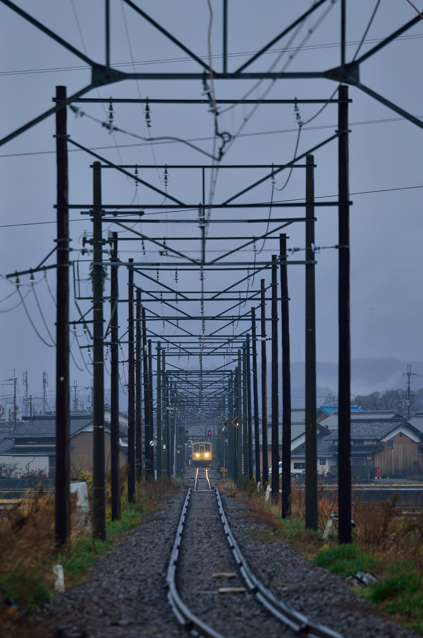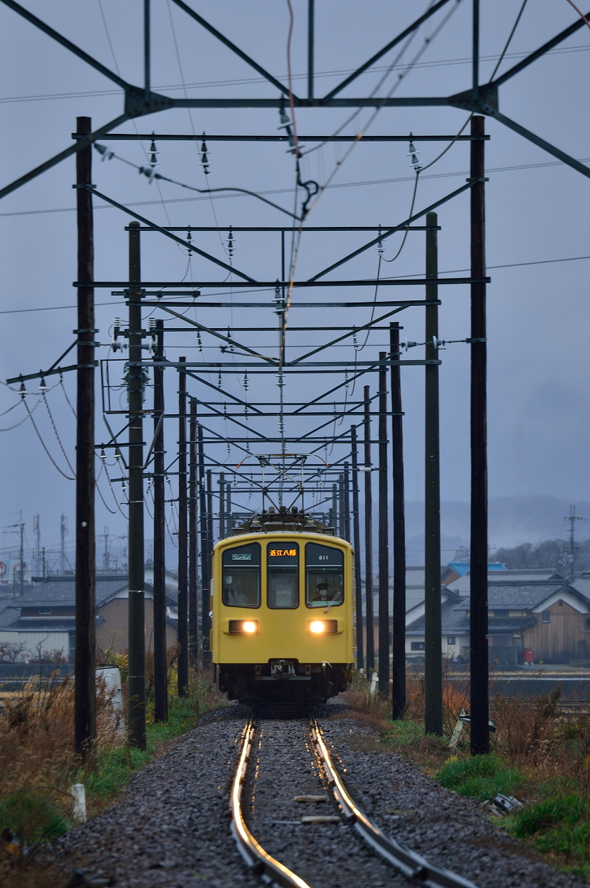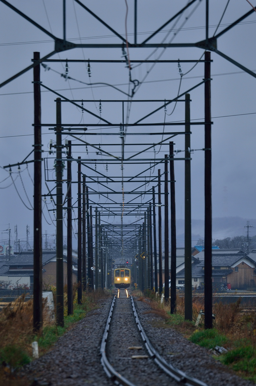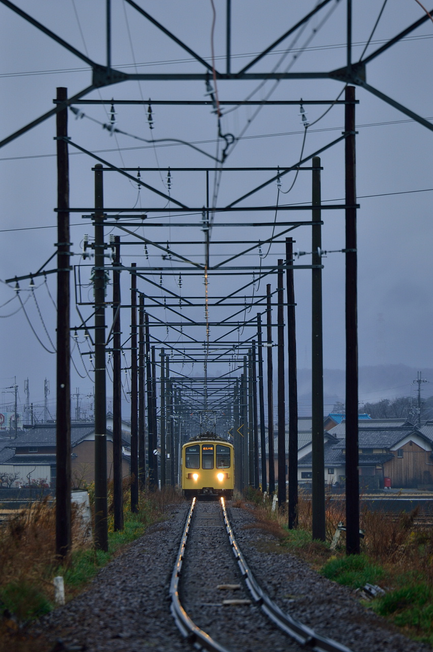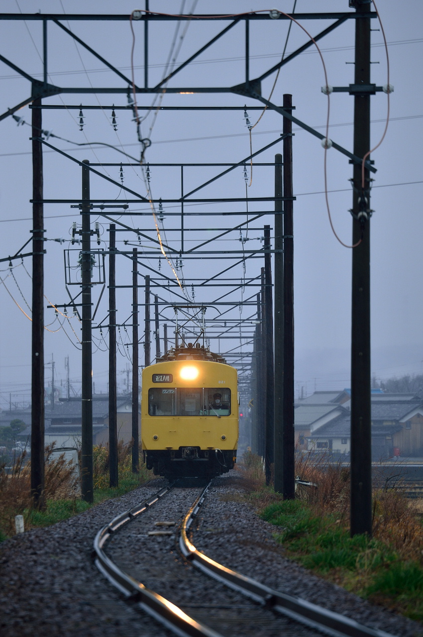 以前から狙っていた近江鉄道八日市線平田駅付近の長~い直線です。気温は低く、朝から降り続ける雨と時々吹く風に体温をどんどん奪われていく中での撮影でした。