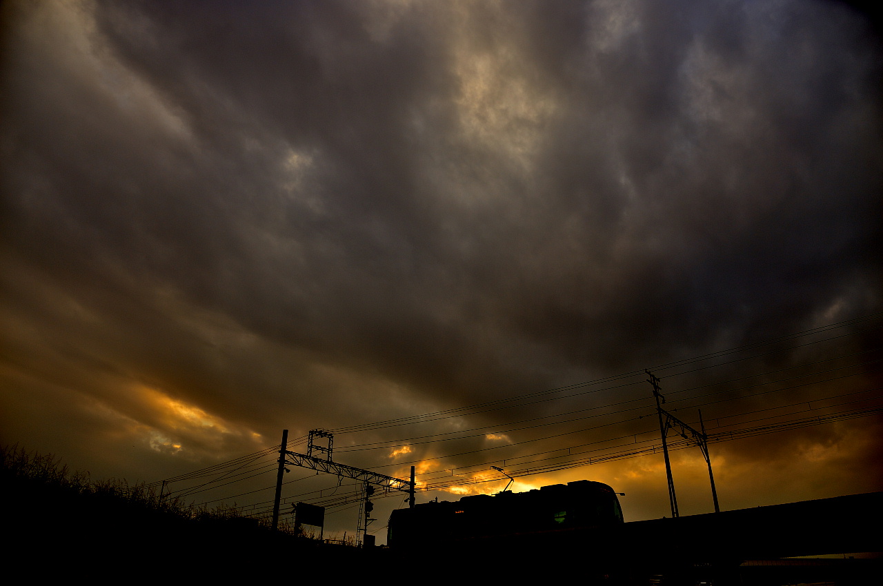 重苦しい雨雲の間から刺す夕日をバックに大きなシルエットを浮かび上がらせてくれました。
