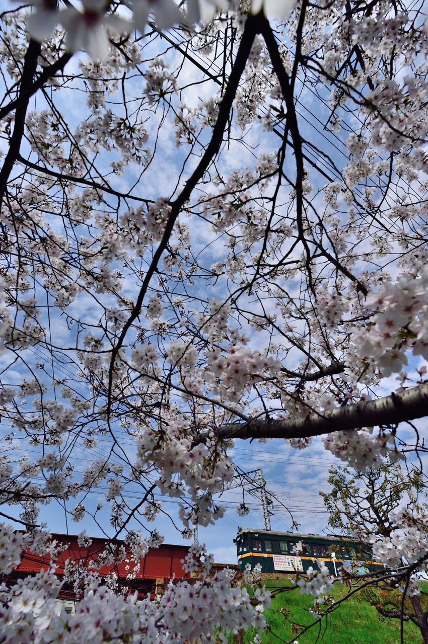 いざ現地に行ってみると下の南海本線の架線や頭上の電線、落書き...いろいろな障害物がありました。そんな中で桜の枝が面白く切り取れるゾーンを探して撮った一枚です。
