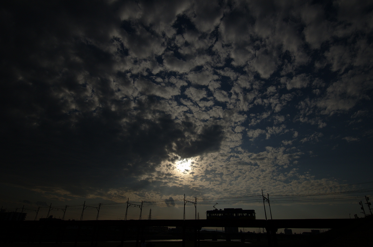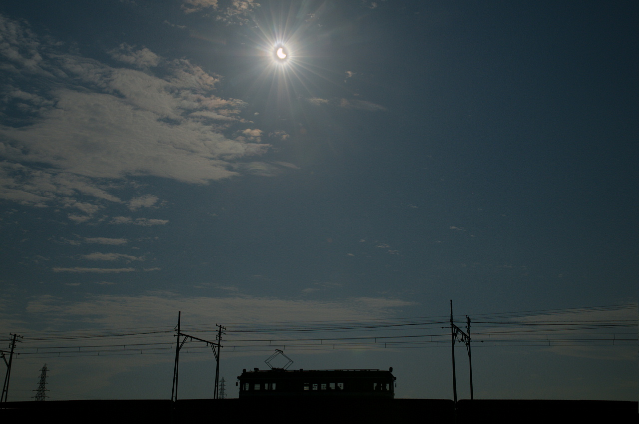 金環食の撮影中も阪堺線の撮影は忘れません。こんな時もちゃんとモ161型はやって来てくれました。露出上、かなり無理があるのでHDR処理を施しています。