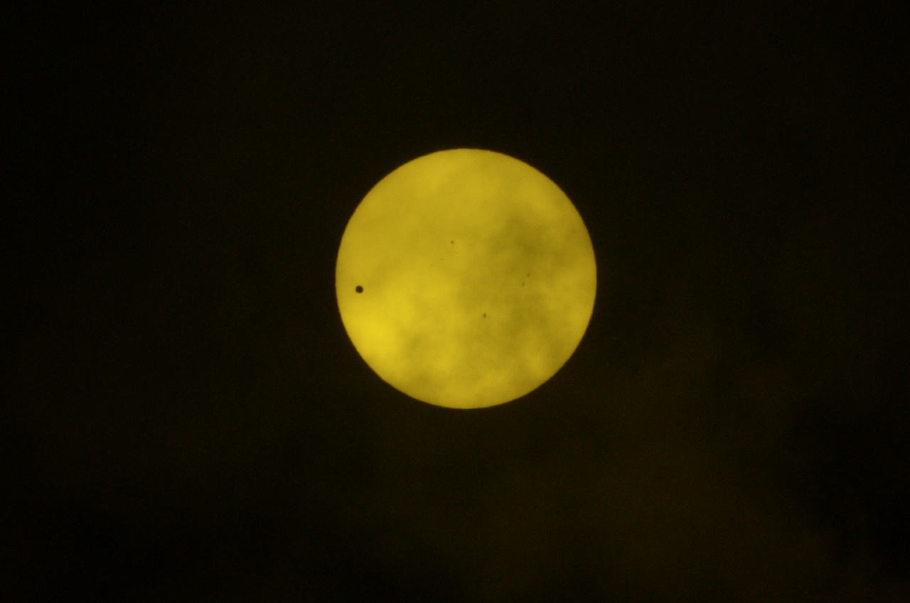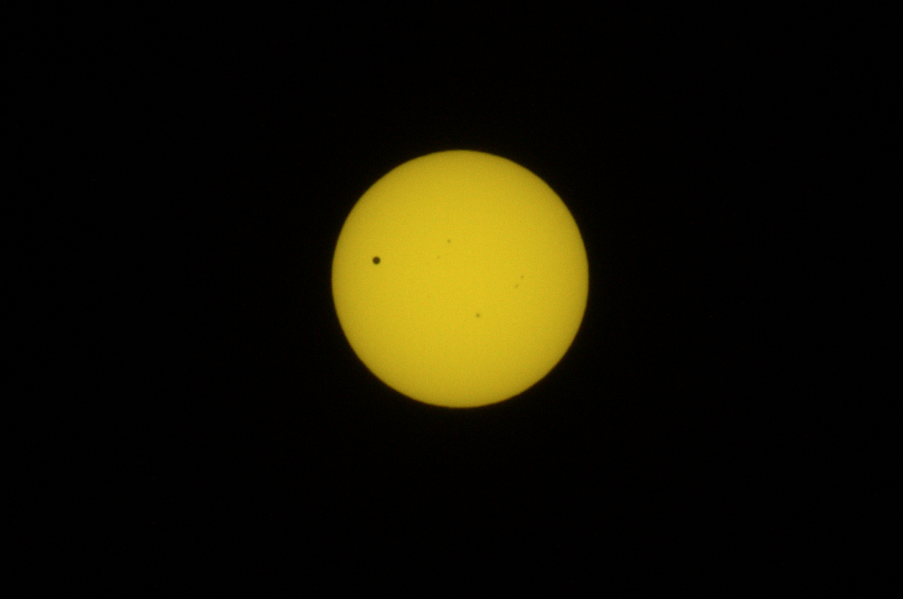 6月4日の部分月食は曇りで見えませんでしたが、今日は金星が太陽と地球の間に入り込み、真っ黒な「ほくろ」として太陽の表面に姿を現しました。