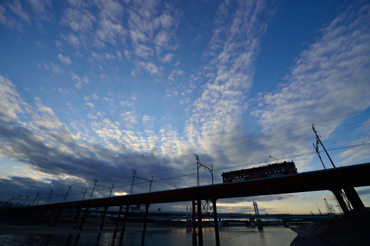 3連休の最後、懲りずに夕方の大和川橋梁にやってきました。夕日は雲の中に隠れていましたが、冬の青空の中にところどころ鱗雲が混じっていました。まずは大きな車体の堺トラムの登場です。