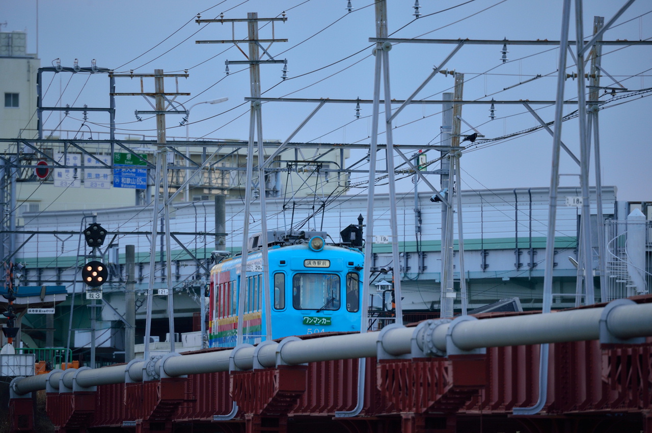 この構図に飽きたところで望遠に切り替えて待っていると、浜寺方面に向かうモ501形の登場。斜め後ろからの撮影です。