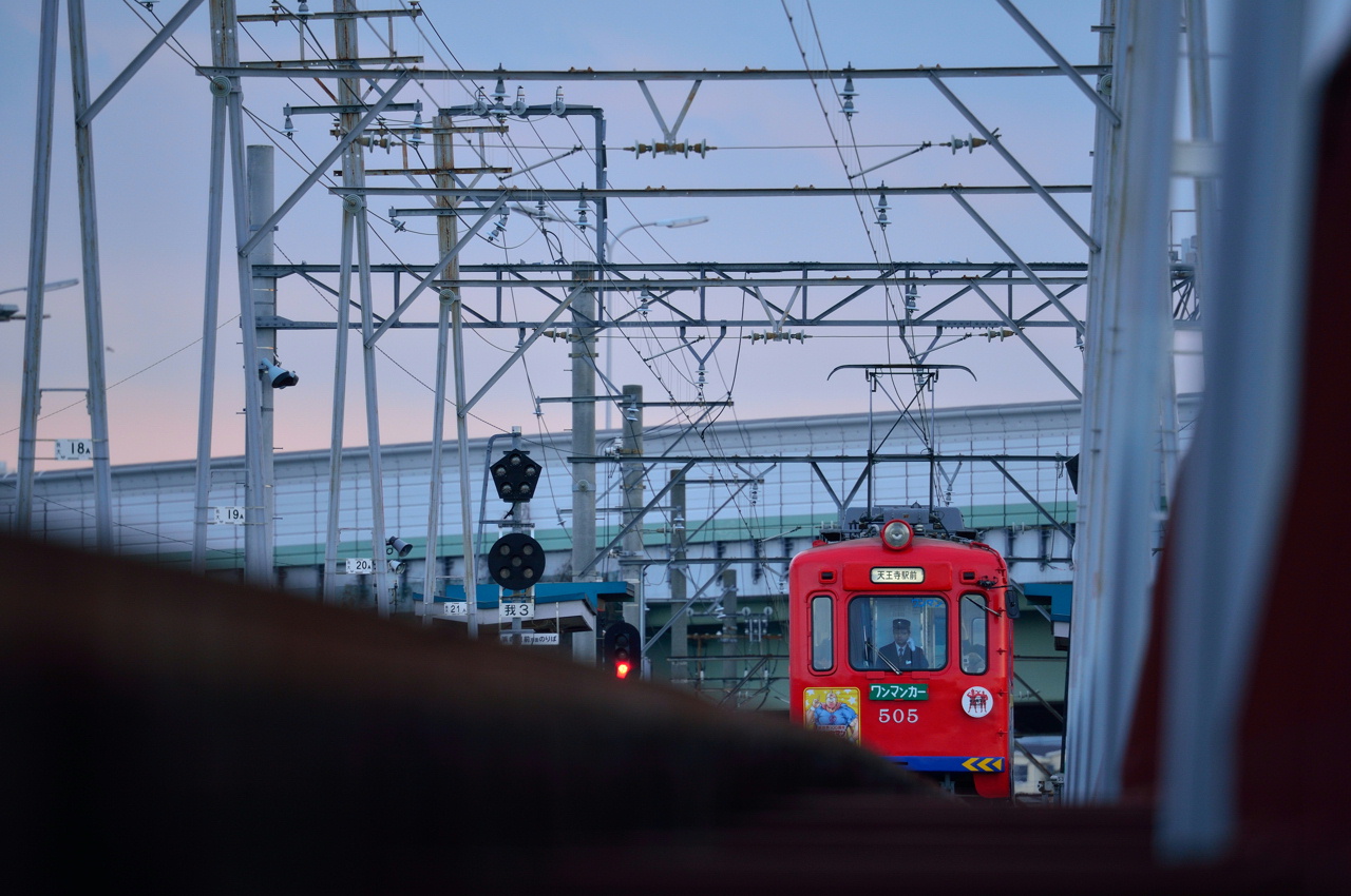 最後は橋の下に潜ってあびこみち方面行きを狙っていると、真っ赤なモ501形が来てくれました。こちらは手持ちで撮り、運転手の方が気にするといけないので早々に切り上げて頭を引っ込めました。