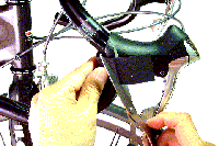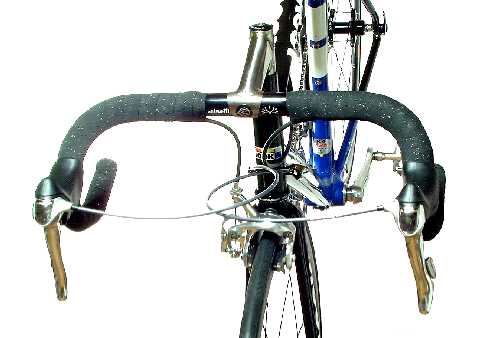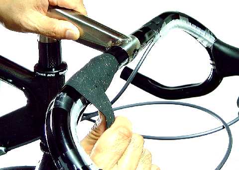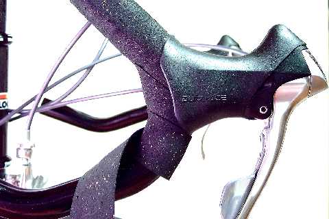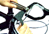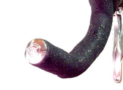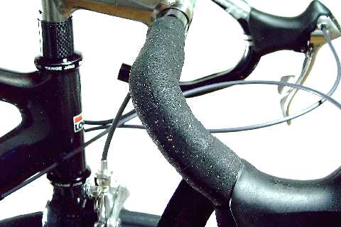 ハンドルの中心部分より巻き始めます。こうすると手元がすっきりしますが進行方向に体重をかけているとテープが剥がれやすいという欠点があります。