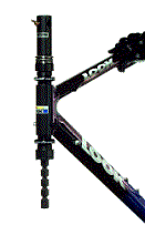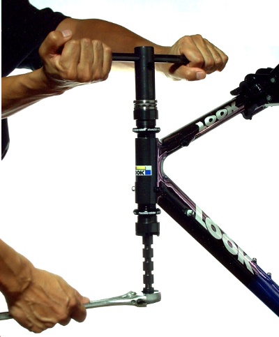 | 圧入工具、ヘッドワン、金具の全てが直線に並び、ヘッドワンがヘッドチューブの入り口に収まっていることを確認します。また、このとき、ヘッドパーツのマークの向きにもこだわりたいものです。 |
