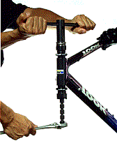 | ヘッドチューブ下部に下部ヘッドワン、圧入工具の金具を順にセットし、手で借り締めします。 |