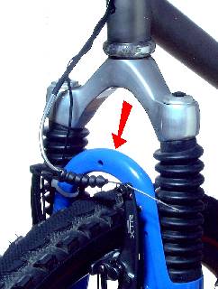 鎹[かすがい]のこと。サスペンションホークの左右のアウターケースをつないでいる部分をさす。