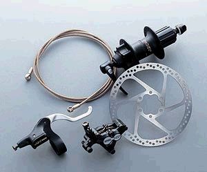 ハブに固定されたディスクをパッドで挟んで制動するタイプのブレーキ。
