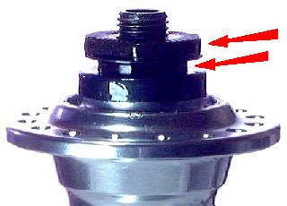ハブの両端のベアリング押さえがずれないようにダブルナットで固定してある部分。