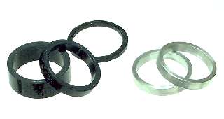 Aヘッドステムとヘッドパーツの間に入れてハンドルの高さを調整するリング。様々な高さのものが用意されている。左がカーボンファイバー製、右がアルミ製。